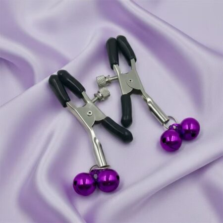 Silver metal clamps with playful purple bells, adjustable tension, and endless erotic possibilities!