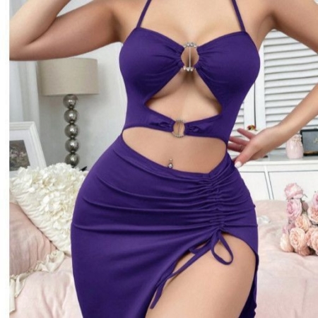 A sultry yet wearable halter dress set featuring adjustable side ties, a flattering open-back design, and soft ruching that sculpts the waist and hips with effortless allure.