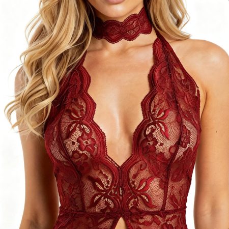 A full-lace deep V bodysuit with convertible choker detail and bold cut-out design, available in red or black for a striking statement.