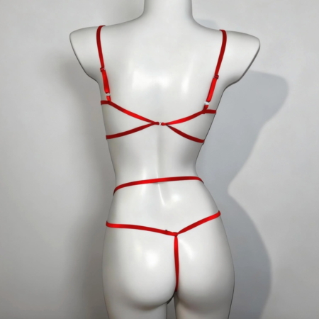 A seductive bra set with bow-covered cups and a delicate waist tie, designed to sculpt and tease in bold red or classic black.