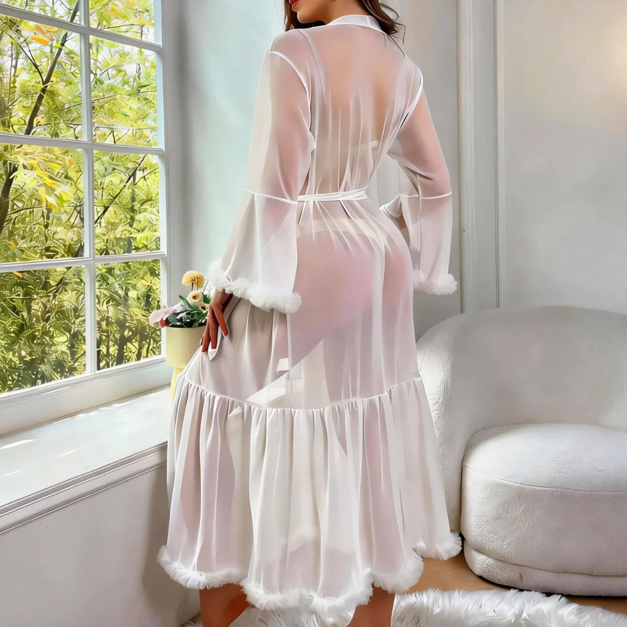 A soft, stretchy long robe with ruffled bell sleeves, designed for a gentle and elegant sensual look.