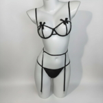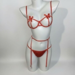 This three-piece lingerie set includes an underwired bra, a waist tie, and matching panties, available in red and black, with each colour styled as a coordinated set. The bra features a supportive underwire structure that beautifully shapes and lifts the bust, creating a defined and flattering silhouette. At the centre of each cup, soft bow details gently cover the nipple area, adding a teasing yet innocent touch that heightens visual appeal.