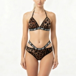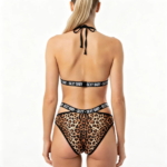 A wire-free leopard halter set with bold black straps and statement lettering — effortless, comfortable, and designed to double as a daring bikini look